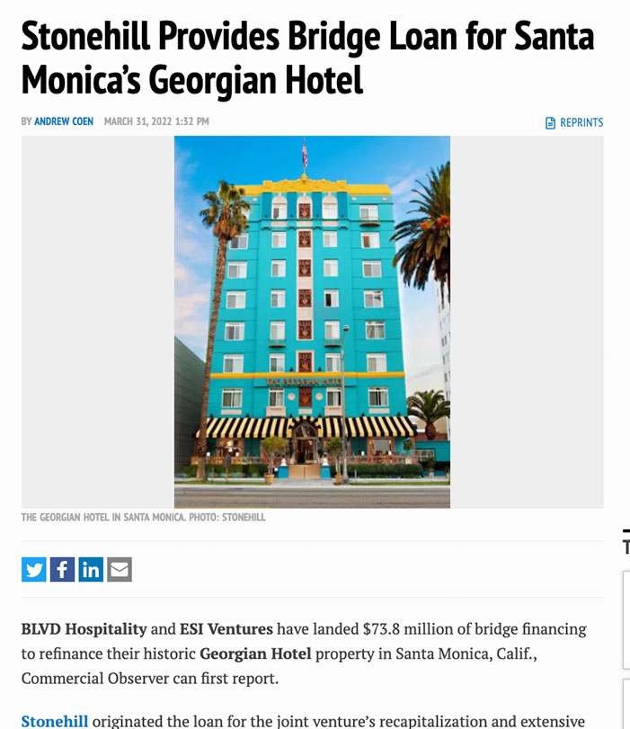 Stonehill Provides Bridge Loan for Santa Monica’s Georgian Hotel